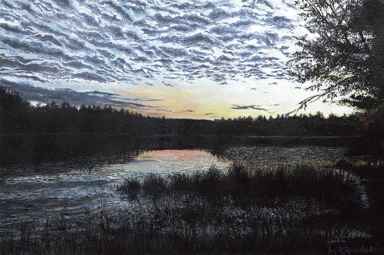 Camping on Mt Desert Island, Maine. I think the most beautiful sunset in the area. Wood strip frame stained Mahogany built by the artist.