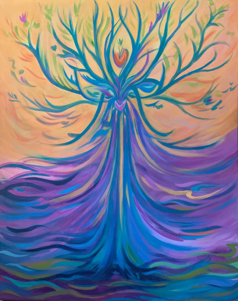 Mudras are sacred yogic hand gestures. This tree figure holds a powerful rooted connection to the earth as waving branches of energy open and lift toward the sky in ecstatic motion. A heart held by double waves above the body symbolizes an uplifting sense of divine connection.