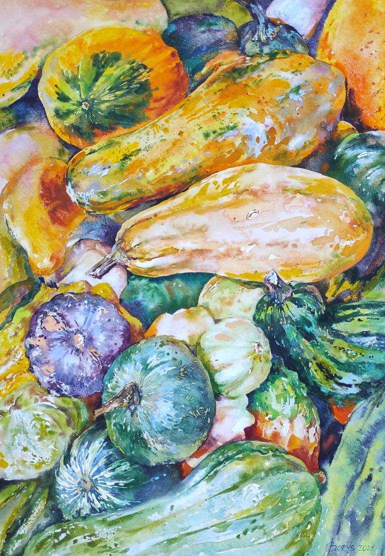 Vegetables of different sizes and colors are painted on paper with watercolors. Their interesting texture and shape adds vibrancy to the painting. The painting is signed on the front side. The painting is sold without a frame. NOTES: The images in your home may not be to scale and are for illustra...