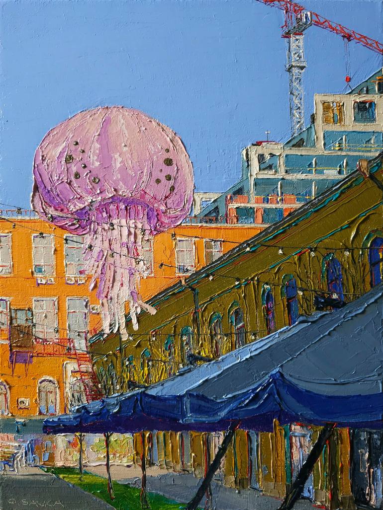 With a jellyfish floating in the air, the painting takes on a slightly fantastical air—yet this scene can truly be witnessed in Kyiv. The orange house has drawn in all the warm spring sunlight. Umbrellas in the foreground await warmer days to welcome their first visitors. The grass on the lawn has ...