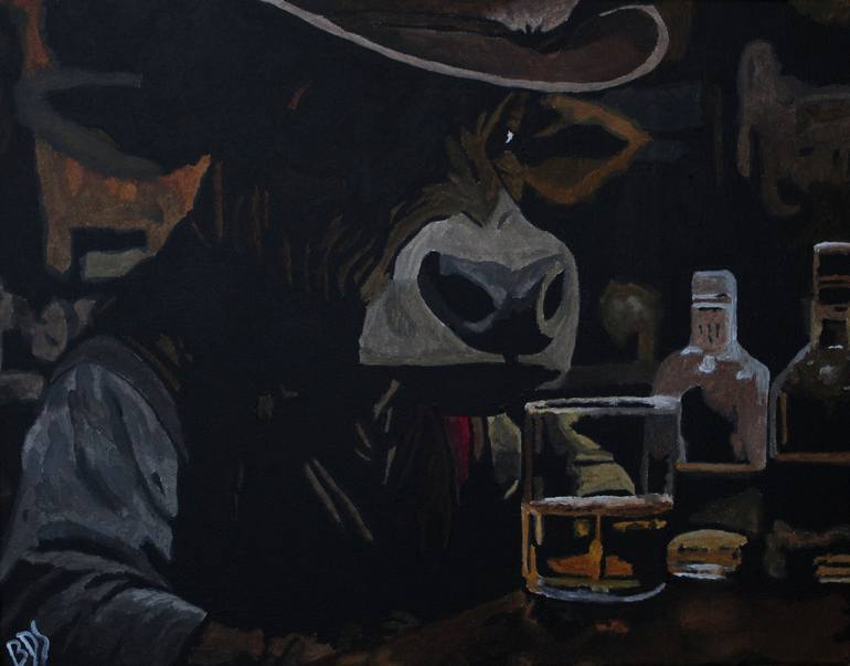 In this third entry from the whimsical Mushroom Soup series, "The Cow-Boy" places a stoic, anthropomorphic cow in a dimly lit saloon, deep in contemplation over a glass of whiskey. Clad in cowboy gear and shadowed by the warm glow of barroom lanterns, this piece explores the surreal humor of animals...