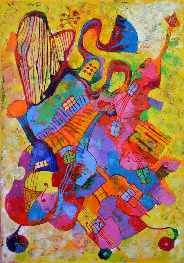 Keywords: vyara tichkova, painting, oil, music, machine, violin, viola, piano, lyre, cello, colorfull, tube