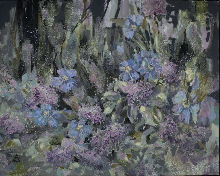 I create a complex pictorial space in which silence resounds. The painting is built on a subtle interplay of depth and light: from a dark, almost graphite-like environment, cool blue flowers and soft lilac blossoms slowly emerge, seeming to flicker in the twilight air. The nocturnal atmosphere here ...