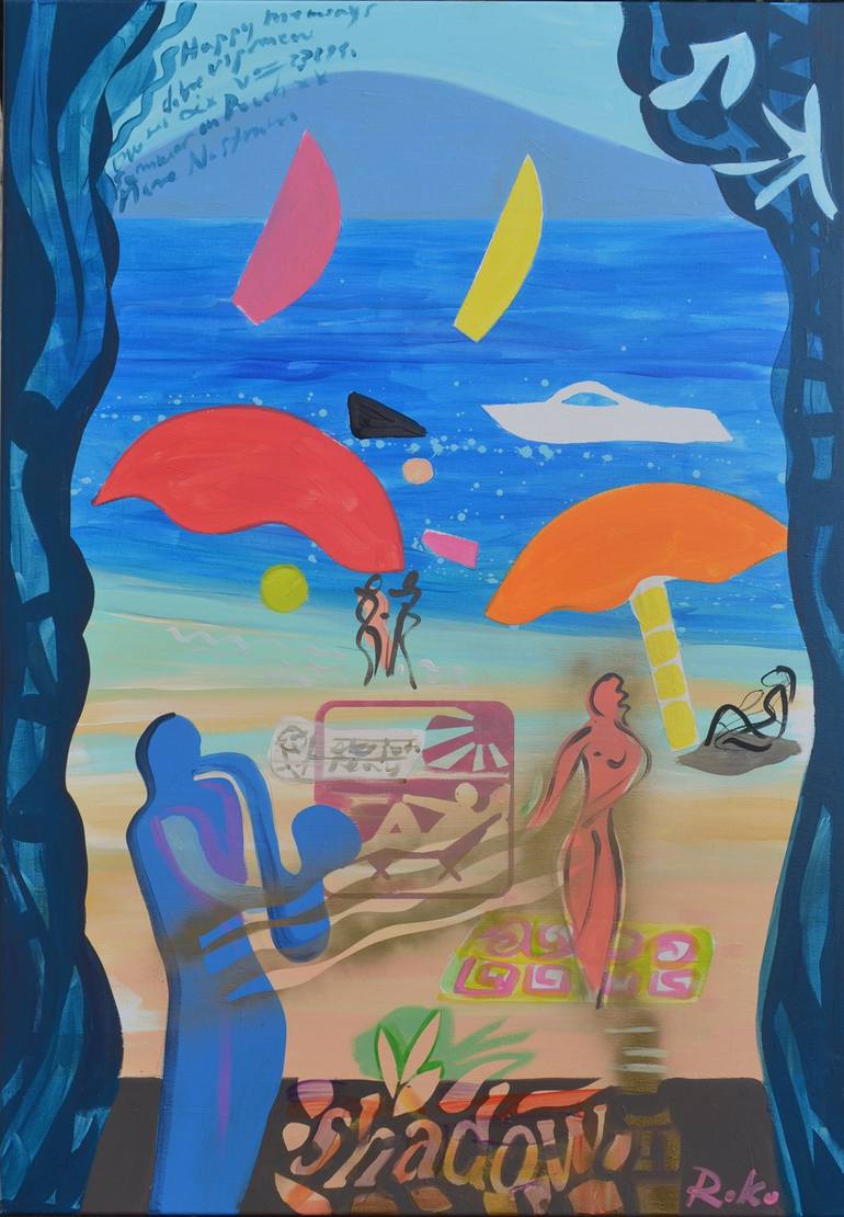 Sand paints are applied with thick coats of paint. Wet in wet. As a contrast to the color of the umbrella and other details with an airbrush in a thin layer. So I painted the airiness and lightness. The sea is painted in transparent colors in several layers for depth. The musician plays the saxophon...