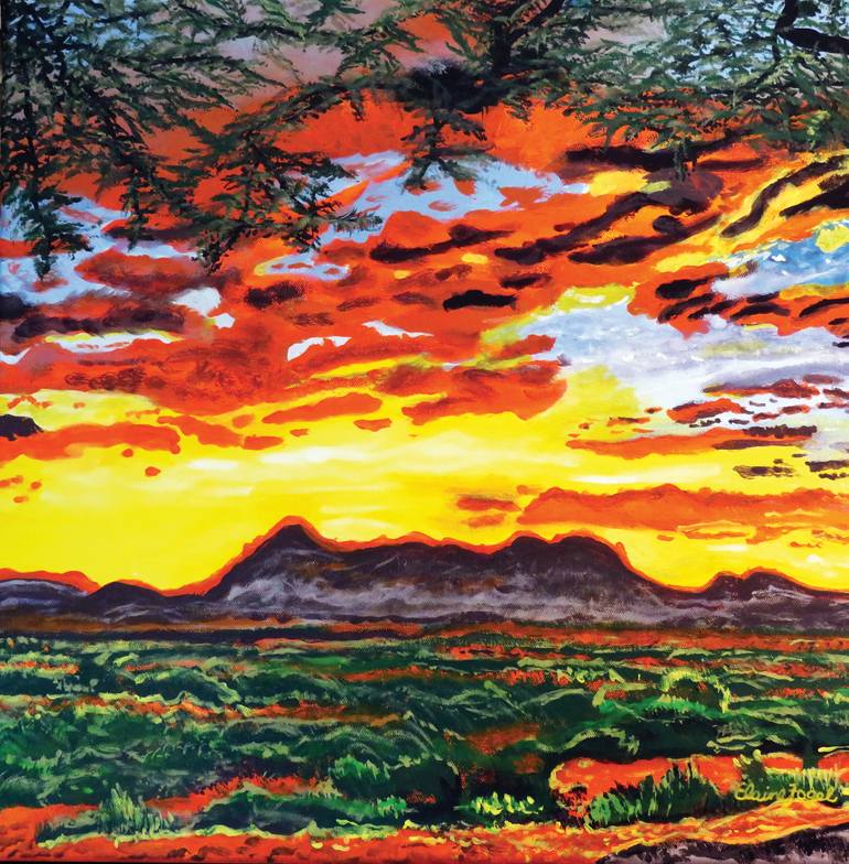 This painting, “Mustang Mountains Sunset” was inspired by a beautiful photo by Harris Rosenberg. This mountain range is located in the southeast region of Arizona, on the northwest side of Fort Huachuca. They are found at the southern end of the Whetstone Mountains. Desert sunsets are truly captiva...