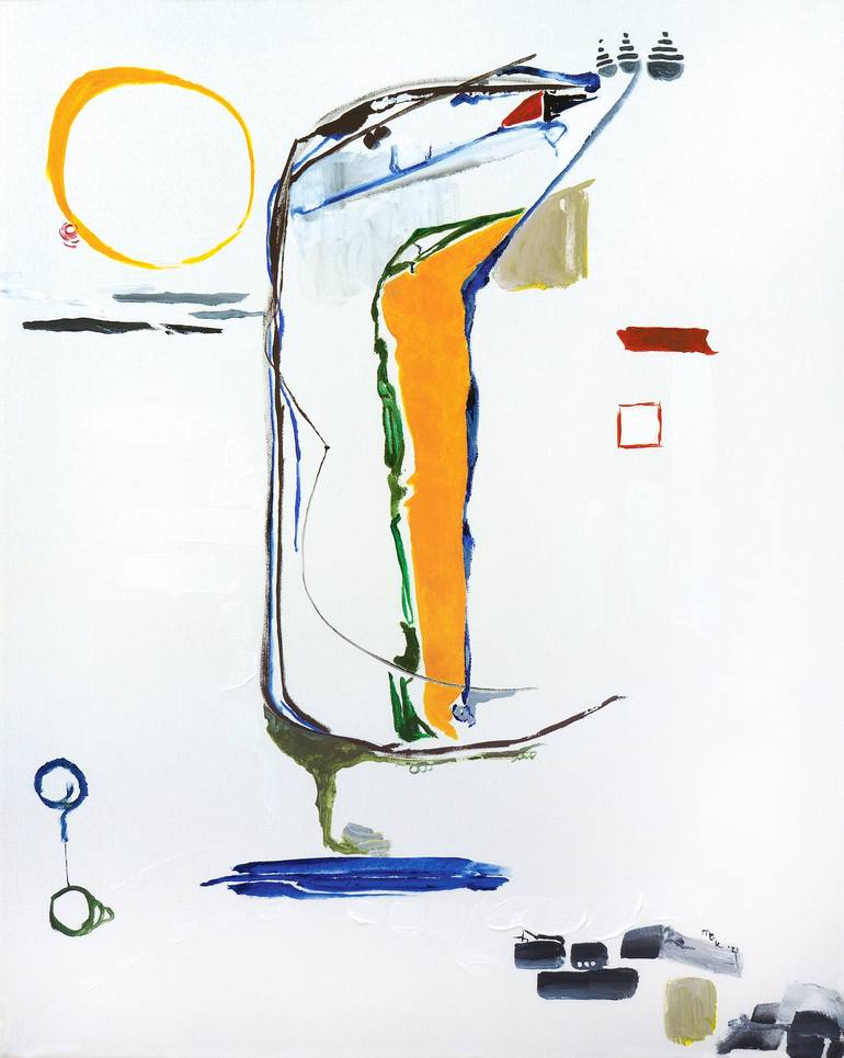 An abstracted self-portrait depicting a form sitting in a meditative state, restricted by consciousness from emptying the mind. The profile faces left, and depicted elements inside and outside prevent the figure from finding solace in meditation. Loosely based on Bauhaus, Modern and Suprematist infl...