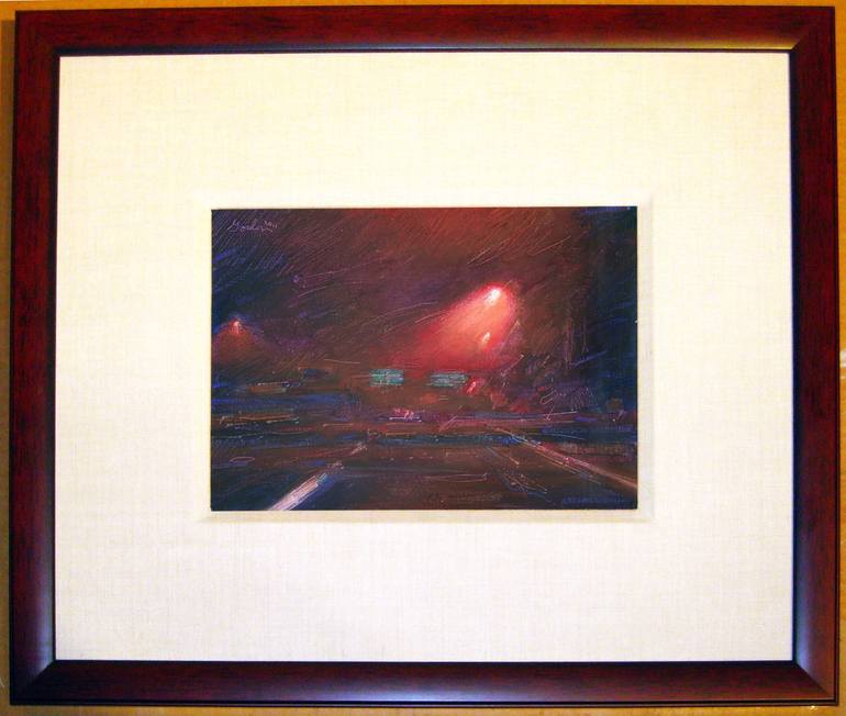 Driving down Highway 29 in Napa coming up to my exit at night. The highway and signs barely lit by the streetlight. I've done a few night paintings and this small oil on canvas paper painting is one of my favorite pieces. It really has that feeling of being alone in the car with your thoughts in ant...