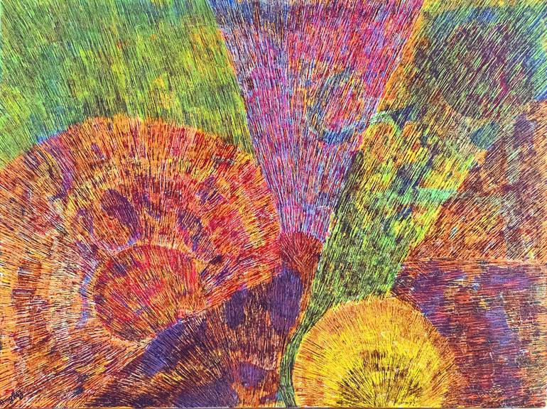 A surreal view of a garden walk capturing the vividness of color and the wonder that it can inspire if we look at it with a child's eye. Visual description: A Colorful Abstract landscape with thick impasto brushstrokes depicting the feeling that walking in a garden inspires, with flowers, plants, g...