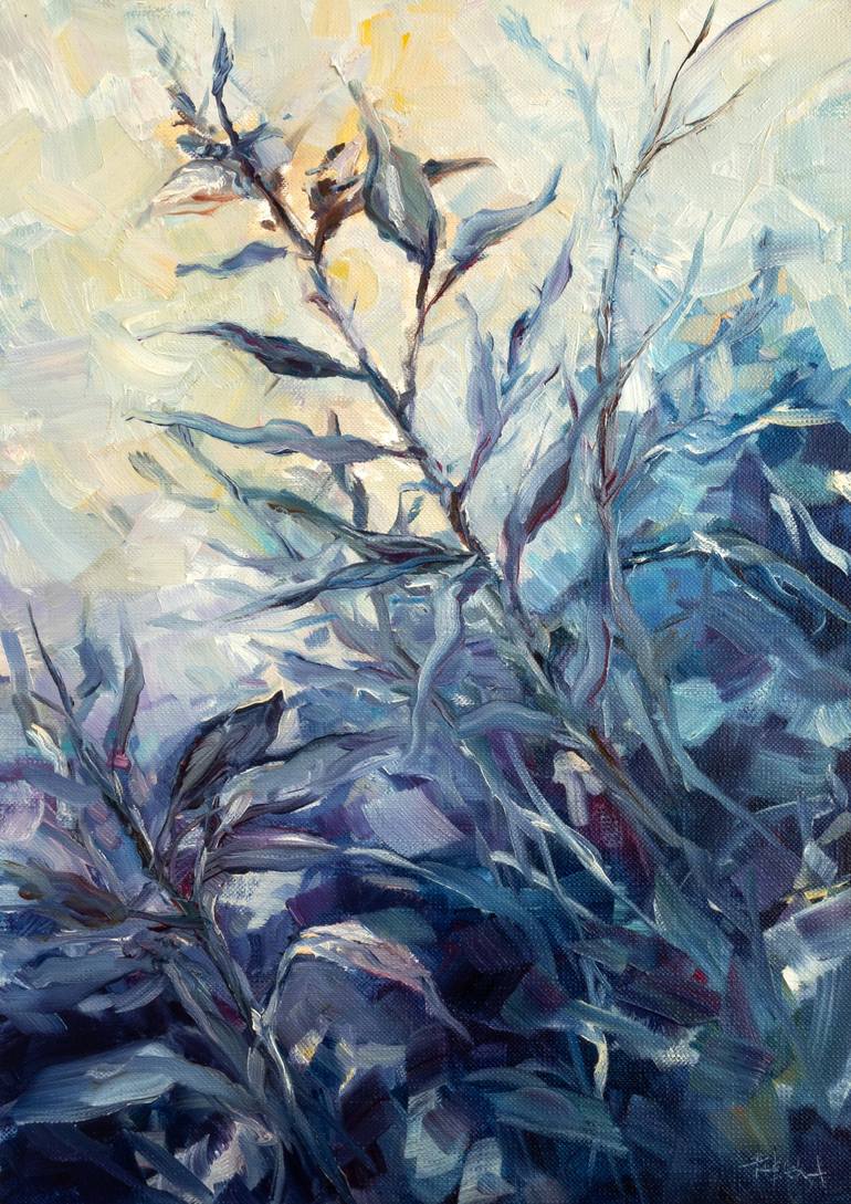 This is an original oil painting on canvas paper, mounted on a white passe-partout. The canvas paper is a heavyweight paper with a textured, coated surface that closely replicates the finished surface of a canvas. You can see a natural, dense group of plants, with bluish, purple colors, contrasting...
