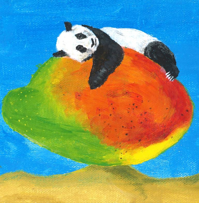 A slightly surreal painting of a panda hugging a giant mango (or a tiny panda hugging a normal mango). Inspired by a friend's love of pandas, the imagery popped into my head and I had to paint it.