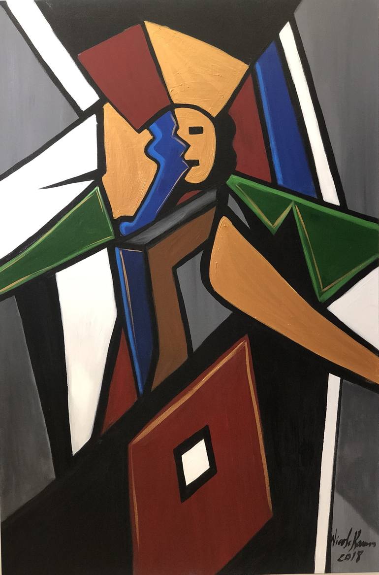 This painting depicts a couple standing side by side the woman is portrayed as the sun in this piece, the man standing next to her wearing a red hat connected to her yellow hat makes them ONE, the message in this piece is that the woman is the source of energy to the man in this painting, with a fac...