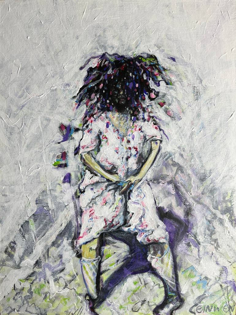 The painting is a portrait of the artist Sophie Soni on her land in Portugal. I was drawn to the image because of the way she blends into the background but equally stands apart from it- creating a disjointed feel. As I worked on this piece I was thinking about grief, the loss of youth and the pass...