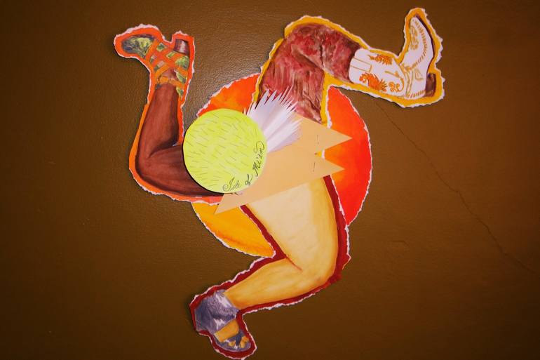 This work is playing with ancient migrating patterns (the triskelion, found through Minoan Crete all the way up to Ireland) and disability. The image of my crippled leg is the "skelion" (limb) used to create this symbol which implied a dynamic movement though the leg is actually quite slow. It drags...