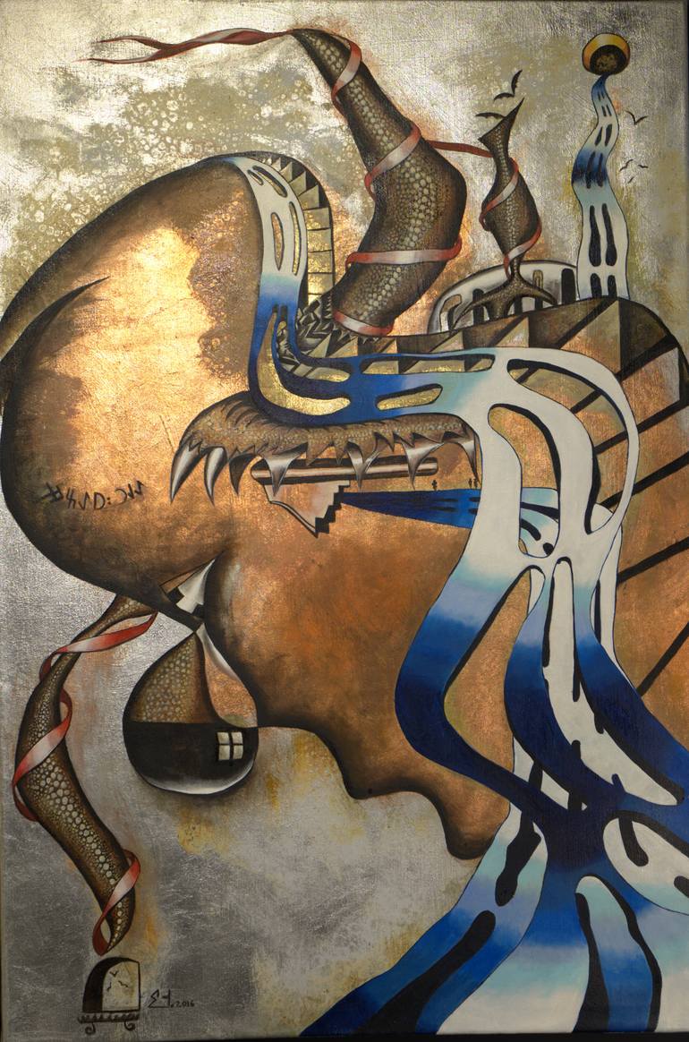 The creation of my works is a multilayered journey. I begin by carefully applying imitation gold, silver, and copper leaf onto the canvas. Then, I sprinkle metallic powders of the same tones to create luminous transitions of light and depth. In the next stage, using a regional marbling technique, I manipulate the density and flow of the paint, giving the surface a vivid and fluid texture. Once this layer is completely dry, I add my drawings and finally enrich the composition with oil paint. Through this process, the brilliance of the leaf, the transitions of the powders, the fluidity of marbling, and the depth of oil paint merge into a unique language that conveys both spiritual and visual richness. Eserlerimin üretim süreci çok katmanlı bir yolculuktur. İlk aşamada tuval üzerine imitasyon altın, gümüş ve bakır varakları özenle yapıştırıyorum. Ardından bu zemine aynı metallerin tozlarını serperek ışık ve derinlik geçişlerini oluşturuyorum. Sonraki adımda, bölgesel ebru tekniğiyle boyanın yoğunluğunu ve akışını kontrol ederek yüzeye hareketli, yaşayan bir doku kazandırıyorum. Bu katman tamamen kuruduktan sonra çizimlerimi ekliyor, sonrasında yağlıboya ile detaylandırarak eseri tamamlıyorum. Böylece varakların ışıltısı, tozların geçişleri, ebrunun akışkanlığı ve yağlıboyanın derinliği birleşerek hem ruhsal hem de görsel anlamda zengin bir ifade dili ortaya çıkıyor.