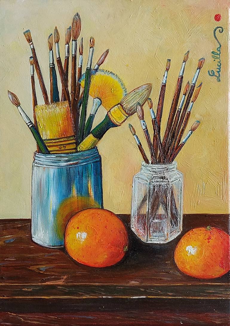 This painting represents a still life with my working tools, especially my loved brushes and two oranges which I ate afterwards, at the end of my work.