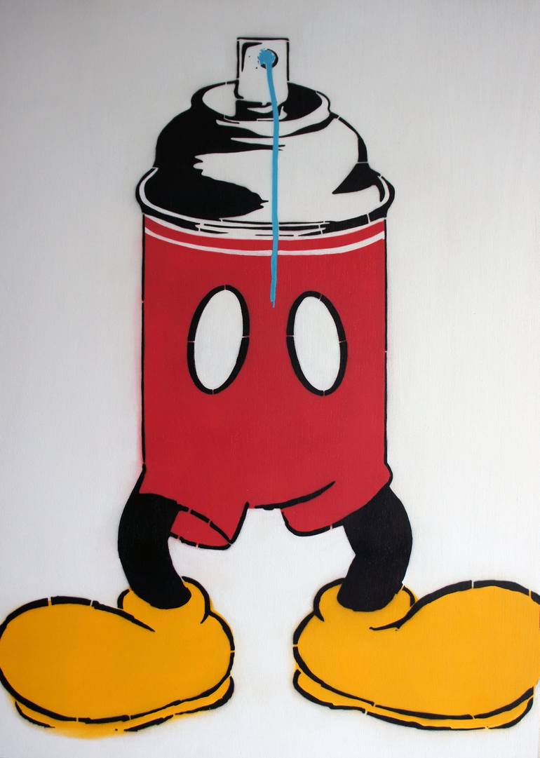Mish Mash Mickey Mouse legs on Mr. Brainwash Spray can. Aerosol on Wood Panel