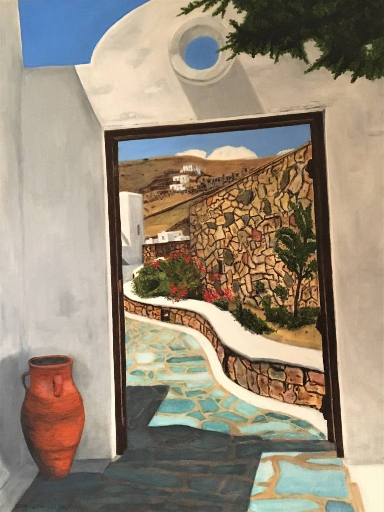 While staying in Mykonos at the Mykonos Grand I noticed their distinctive paths, wall, landscaping between buildings and rooms. I had to express the look , feel in oil. Hope you enjoy