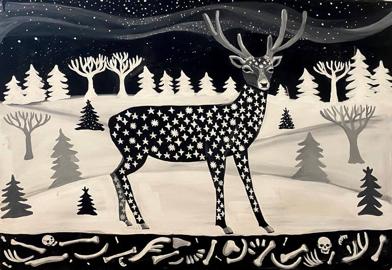 The work is inspired by the mysteries of the night. I wanted to paint the cold contrast of the dark winter and cold white snow. The deer is gentle and resilient and knows the cycle of the seasons and the cycle of life. Everything is hibirnating waiting to come back to life.