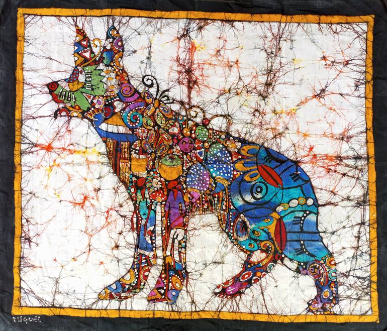In "Mystic Shepherd's Dream", the iconic German Shepherd comes alive through a stunning fusion of color, form, and symbolism. This abstract batik painting layers vibrant, multicolored patterns and intricate details to reveal a world within the dog’s silhouette. A textured background of intersectin...