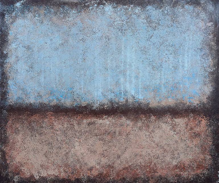 Painting is a dialogue between elements, where sky and earth merge through texture and color. The upper part, in soft blue, evokes ethereal airiness, while the lower section, in earthy browns, suggests grounded strength. The blending of tones symbolizes balance, movement, and the passage of time. O...