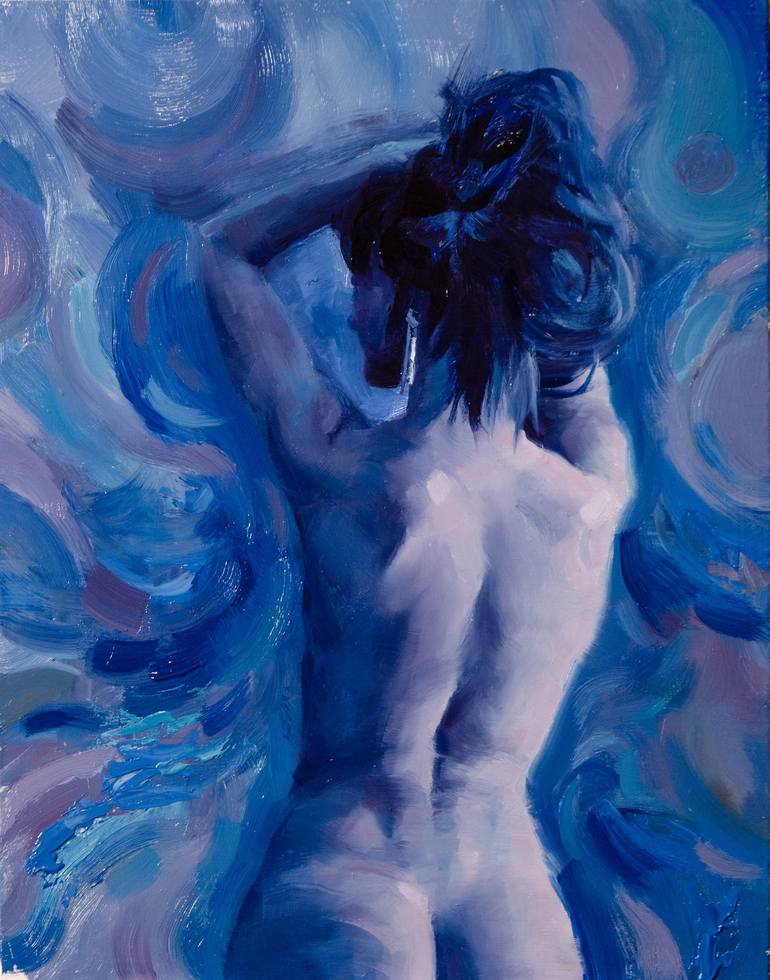 This painting captures a striking composition in which the figure of a woman, seen from behind, emerges from a swirling sea of blues and purples. The brushstrokes flow in circular and undulating patterns, creating a sense of movement that contrasts with the sitter's calm and contemplative posture. H...