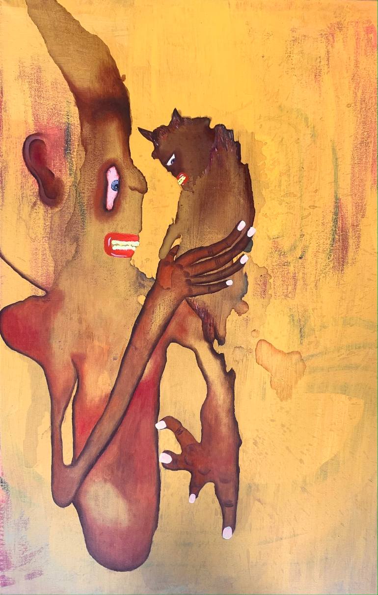 In this work I wanted to paint a funny scene in which a child is schooling their cat because the cat did something bad. I wanted to show the stress in the childs eyes and the guilt in the cats eyes without making it to heavy. Its all in all a fun innocent interaction between child and animal.