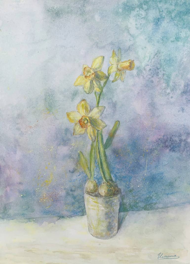 NEW DAY Soft pastel, watercolor, paper. One of a kind artwork Size: 31.4 х 41.4 cm (unframed) The painting is titled and signed on the back. I've always liked daffodils. They are one of the first flowers that start to bloom in early spring. Narcissus was known to the ancient Romans, they used its f...