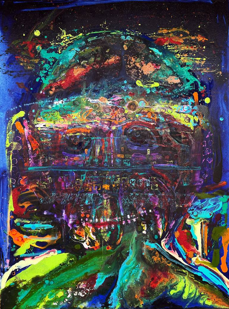 Experimental painting.Colorful surreal figurative-landscape. created 09.2023 36x48 inches acrylic medium. Gloss varnish.