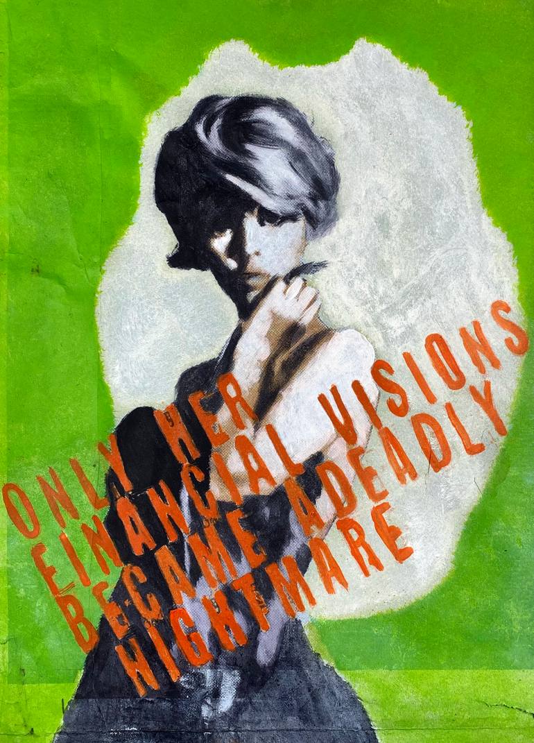 NIGHTLY UNREST An illustrative and figurative painting with a young woman and text. Perhaps it should put a focus of criticism on the widespread hedonism and superstition among the rich-kids. It is painted on the backside of an decayed advertisment-poster. Hannover, 2023 painting oil on paper dime...