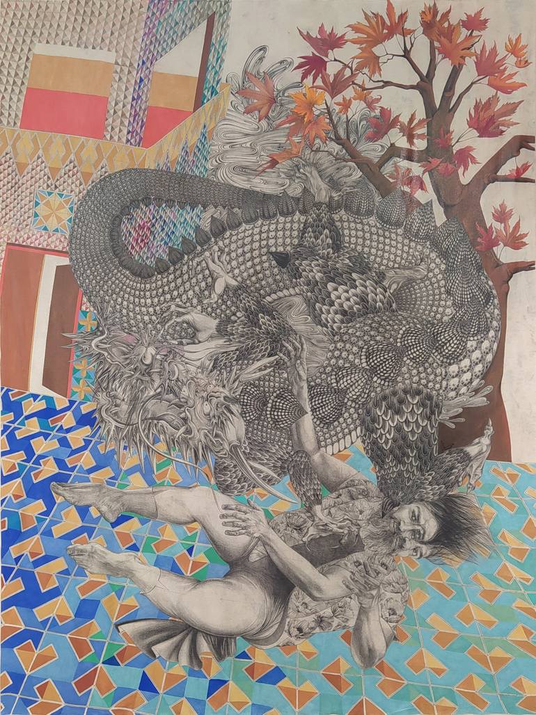 This work is one of my collection of works titled "Dragon over warrior". In this project, I have researched and worked on the dragon mutif in the mythology of different cultures of the world. Also, in this work, I have used Iranian miniature paintings. I have used Acrylic, Graphite and Varnish on C...