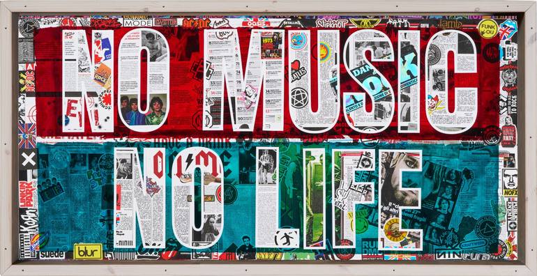 “NO MUSIC NO LIFE” is a vibrant homage to the universal importance of music, combining bold typography with a collage of iconic music-related images and memorabilia. The phrase “NO MUSIC NO LIFE” is prominently displayed in the center in large block letters with a white outline, standing out against...