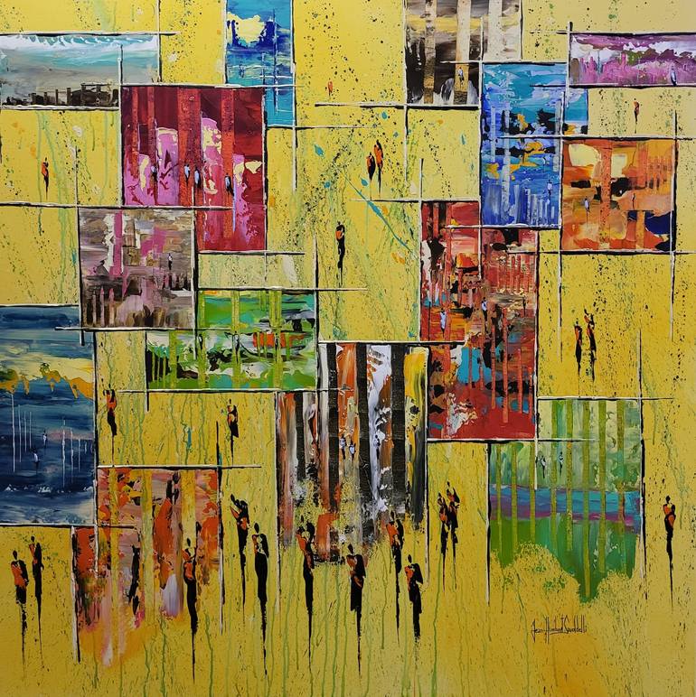 DETAILS OF THE ARTWORK ON YOUTUBE : https://www.youtube.com/watch?v=OmzGkl7kaXI Abstract painting on XL canvas, (120/120 cms) the silhouettes give to the artwork a figurative and human touch. Acrylic on canvas, painted with palette knives, edges painted in black, high quality varnish, ready to han...