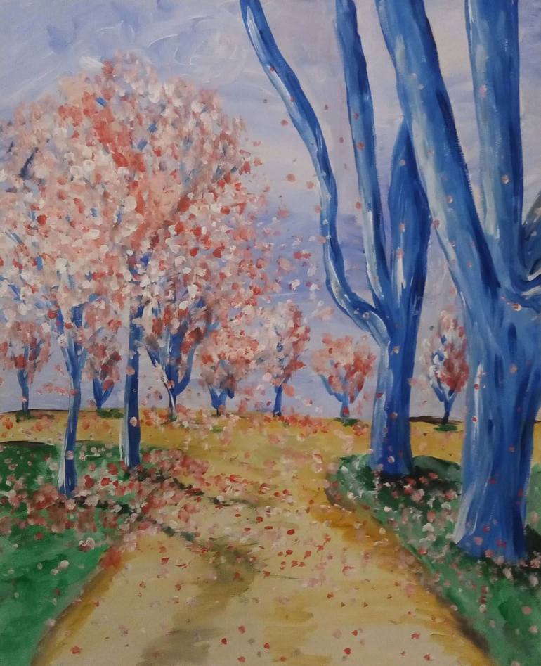 Il quadro è realizzato in tecnica mista acrilico e tempera su tela. La dimensione è di 60x40 cm. I colori della primavera tra gli alberi di ciliegio in fiore ispirano l'opera. Un'aura di calma, di un leggero vento che fa cadere i petali pervade il quadro. I colori nascono da una sensazione profonda ...