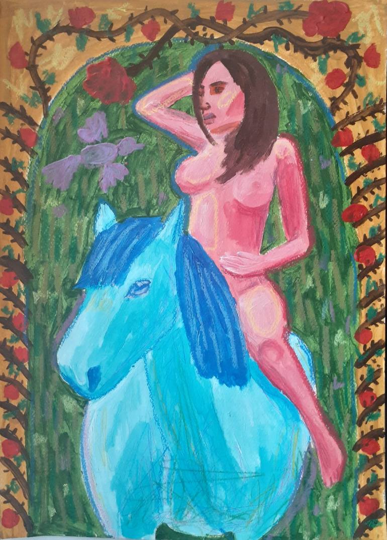 Acrylic, Pastel, Colour pencils on paper. Naked rider. A3. 2021