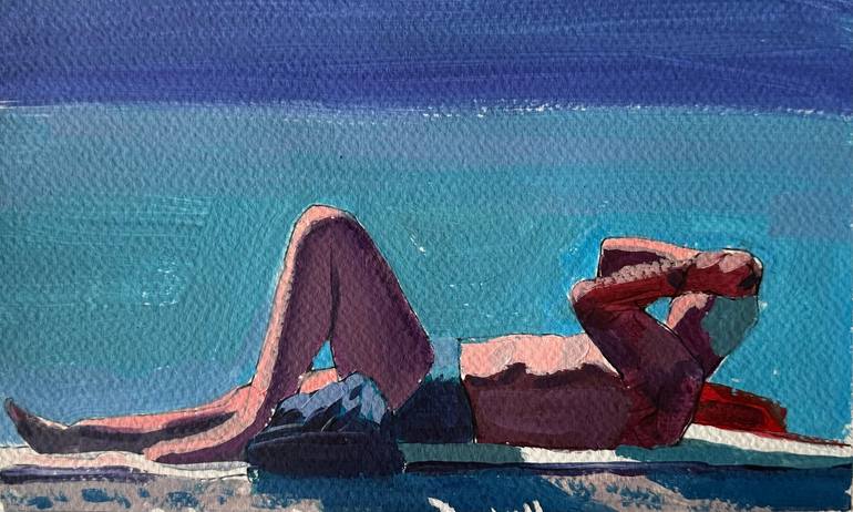 A man waking up from a nap by the sea. He gazes out onto the ocean in total peace. The colors used were a limited palette of ultramarine blue, violet, and cadmium red.