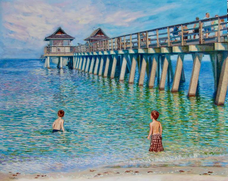 This is a large painting of the Naples Pier in Naples Fl . The painting is large to try and convey the vastness of the ocean and the length of the pier . This is a real image of the pier showing the strong presence of the pier . The blue ocean shows the warm summer day in the bright sunshine with p...