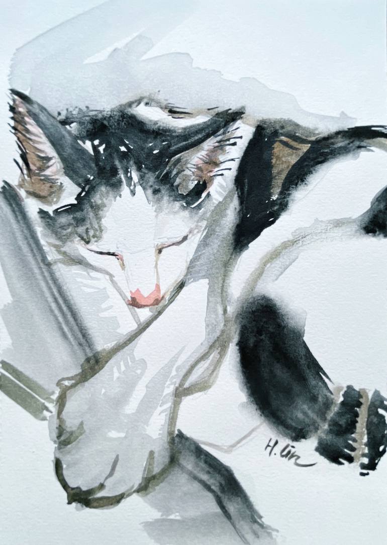 Napping On My Favourite Spot - Cadbury the cat series By HSIN LIN The artwork is ready to hang with D rings and wire attached at the back along with a stand. (Two display options) 29/11/2022 Artwork size - 20cm (H) x 15cm (W) Framed size - 22 x 17.5 x 1.5 cm Sign at front Watercolour on 200 gsm Aci...