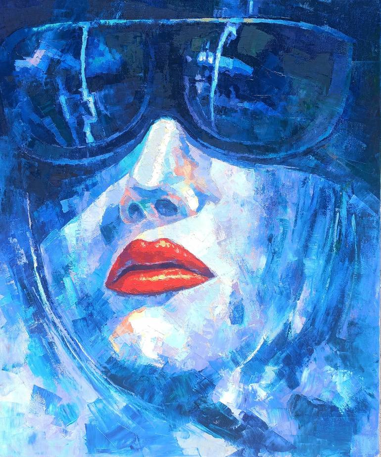 OIL/CANVAS Size - 50x60cm READY TO HANG Original oil painting, 100% hand painted on canvas. Come with signed certificate of authenticity. "Behind the Sunglasses" is a striking 50x60cm oil on canvas that captivates with its bold, expressive strokes and a palette dominated by cool blues and vibrant ...