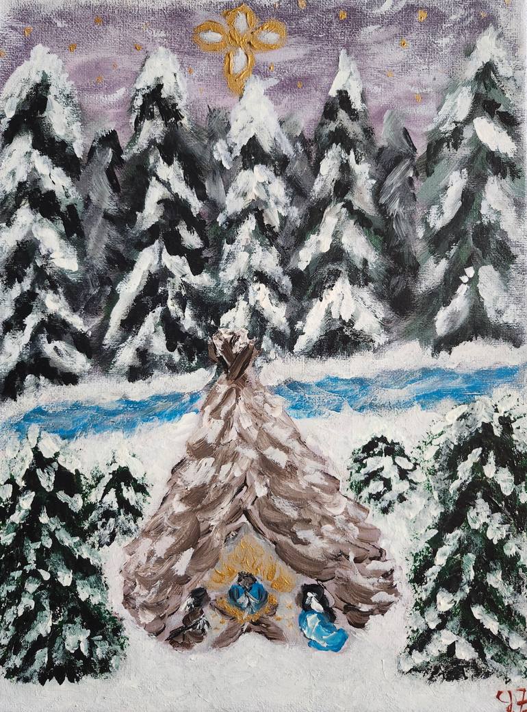 This is a 12x16 acrylic painting on a stretched canvas of a Native American family set in a teepee in the snow-covered forest. The teepee is surrounded by snow covered trees with a river running through the woods. My inspiration for this painting was the Nativity at Christmas and a native family as ...