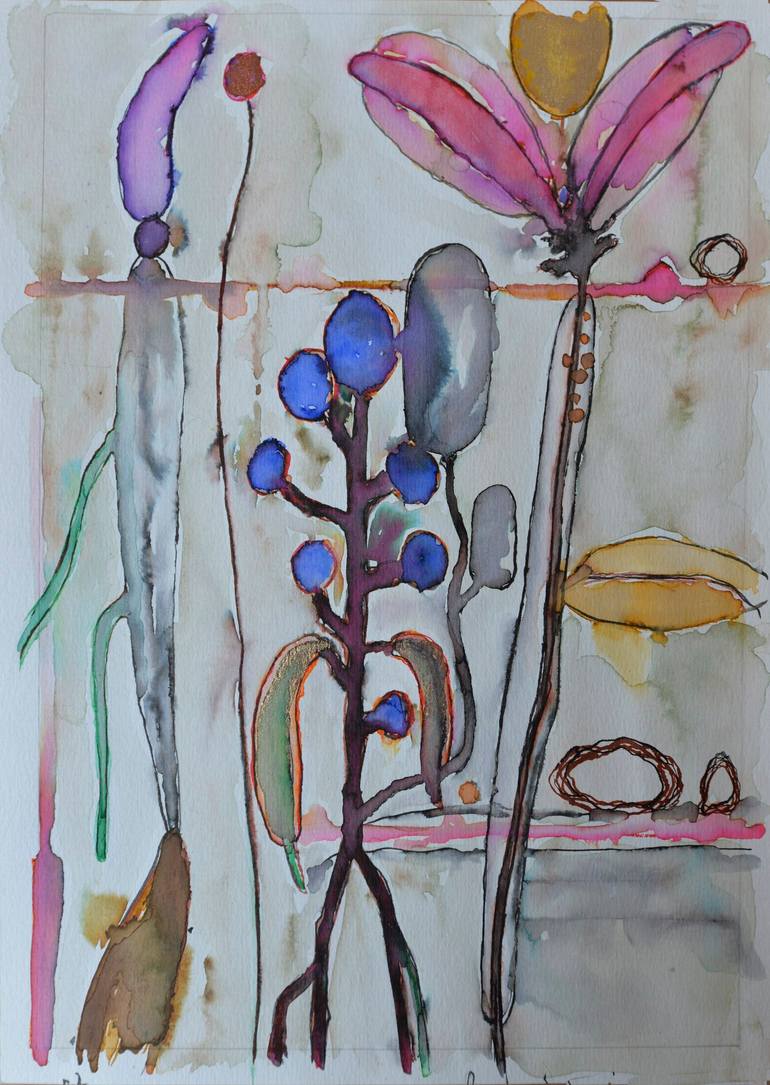 During the Corona period I was inspired by natural forms and colors I came across the beach and dunes, in the woods, in the parks and gardens. In my oil paintings I use natural forms as well. They confront with/stand opposite to industrial forms and materials, but in this watercolor painting I isola...