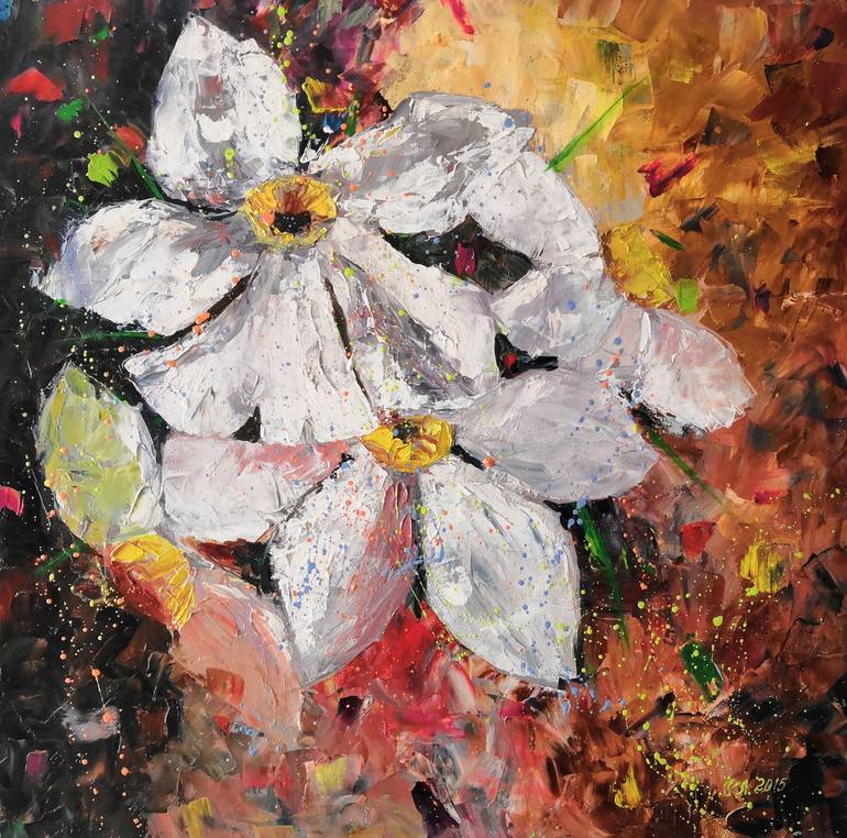 Painting "Narcissus", 2015, oil, canvas on a stretcher 19.7x19.7 inches. Interior, bright, greasy smear written by palette knife. This picture is suitable for almost any interior. The artwork has texture, you can feel the strokes by touching the painting. Stretched on a wood stretcher, edges painte...