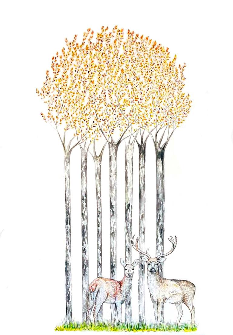 Step into the bewitching world of "Nature is a Haunted House," a watercolor masterpiece that captures an ethereal moment in the heart of the wilderness. Here, a pair of deer, their eyes wide and cautious, stand frozen at the edge of a forest glade, as if taken aback by the sudden presence of the vie...