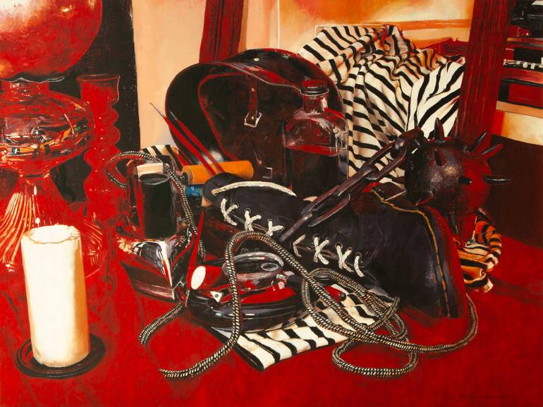 Nature Morte; Punk et Vermillon; Huile sur toile \ Oil on canvas 36” x 48” Avec botte, fer, casque de la deuxième guerre mondiale, fléau d’arme en bois, chandail rayé, bouteille et autres 2024-05-21 Québéc S1148h -C’est la première d'une série il y en aura plusieurs. / This is the first of a series...