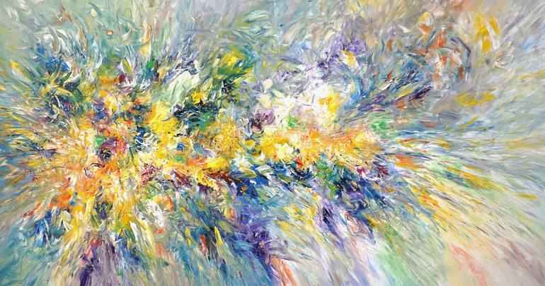 Large abstract painting. Original abstract expressionism art. 78.8 " width x 41.3" height x 1.5" depth. (200 cm Breite x 105 cm Höhe x 3,8 cm Keilrahmenstärke) Original painting. Modern, colourful abstract artwork. White, yellow, green, magenta, red, orange, blue, violet. It was painted with prof...