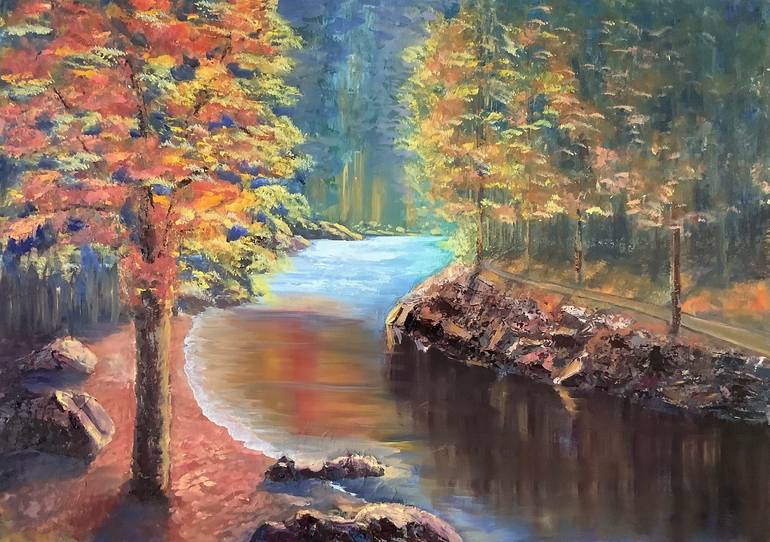 Digital download print. Oil painting. Nice nature, river, autumn. Perfect gift for your friends or for your home.