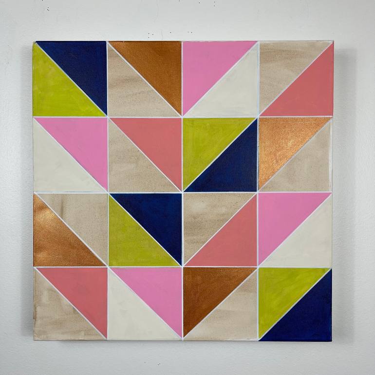 Navy Blue Lime Metallic Bronze Pink Geometric 20x20 Painting