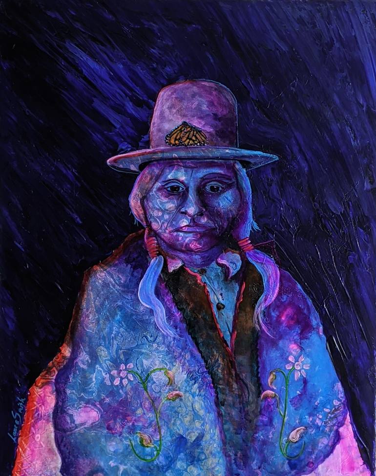 My version of the traditional sitting Bull photo it is a bright vivid painting but also elements of darkness and shading