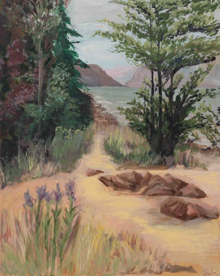 The painting captures the serene beauty of lakeside nature. Relaxing hues invite the viewer to imaging sitting in peaceful contemplation. The piece is custom framed in maple wood with hanging hardware included.