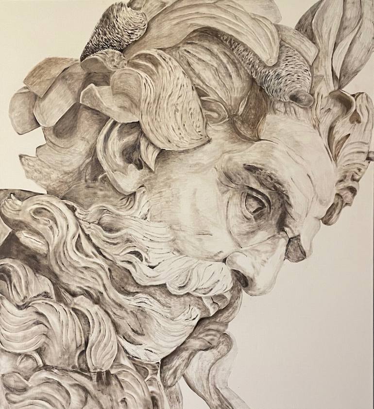 After a long time of free drawing and paint in watercolors I was searching for a new challenge suitable to my ideas of creating realistic images in big format. Because of this I discovered the Dry-brush methodology giving me the possibility to give my works the illusion of a perfect monochrome image. Current there are 3 different projects on going: • Sculptures of the Greek mythology because I’m interested in. • Images of young people from social engagement. • Modern images based on collages made from ceramic sculptures made by Nicole De Pril. Dry brush can be applied as well with oil paint as acrylic. In fact it is painting with a dry brush (Brush in paint, rub the brush on kitchen paper until almost clean and paint). This process takes of course a long time. The modern images are a combination of collages and painting with oil paint to become a coherent well-balanced image. Some of the images are treated with Epoxy to give more dept and change the focus to the background.