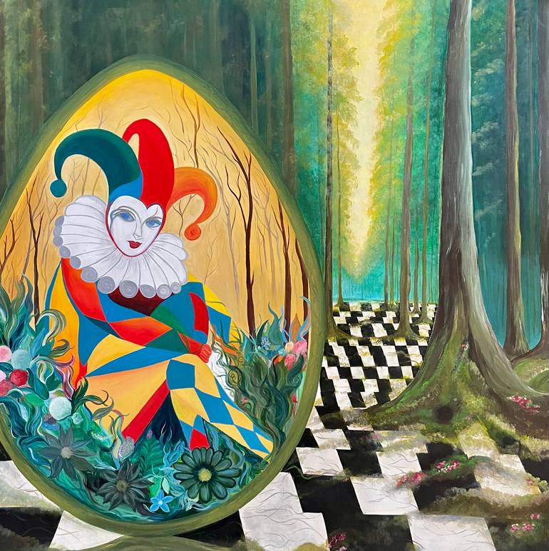 This painting captures a striking interplay between whimsy and mystery. At the center, a vibrant harlequin figure dressed in bold, multicolored patterns sits within a large, Russian-Egg-Shaped frame, symbolizing both fragility and transformation. The figure’s jester hat and ruffled collar add a play...